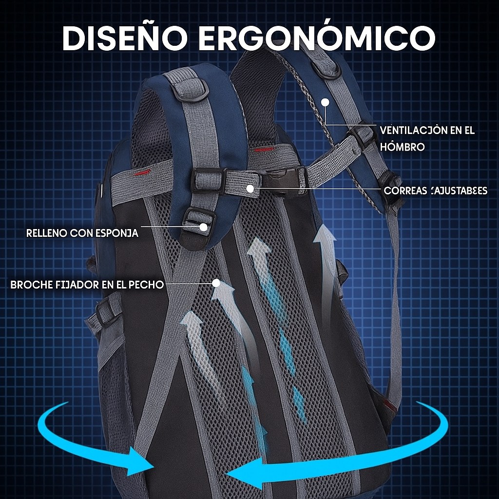 Su diseño ergonómico, liviano y acolchado te ofrece una experiencia cómoda durante todo el día. Las correas y la espalda están recubiertas con malla transpirable para evitar la acumulación de sudor y mantenerte fresco incluso en caminatas largas.